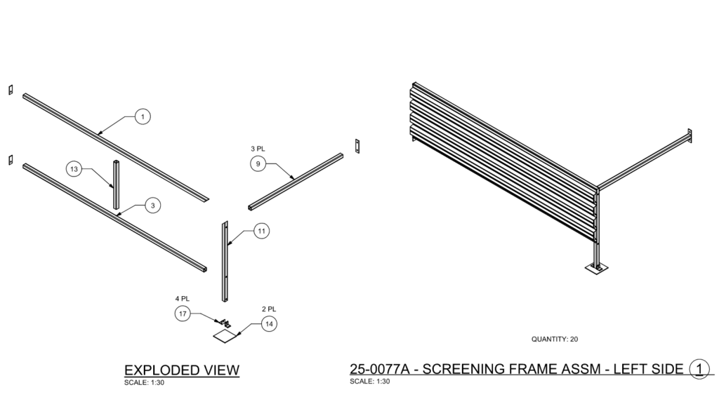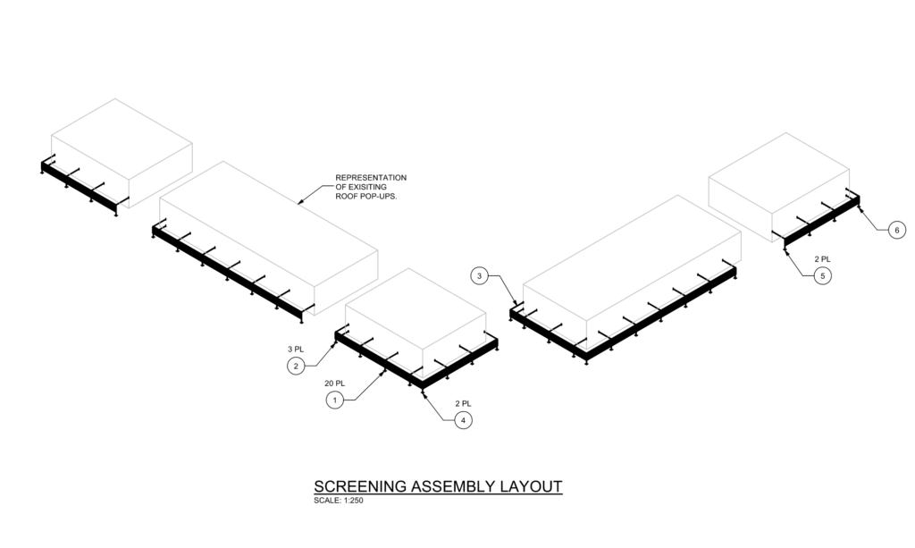 Rooftop ScreeningImpact EngineersApril 30, 2025Commercial Fabrication drawings for rooftop screening assembly. Assembly is braced back against wind by existing jogged roof areas.